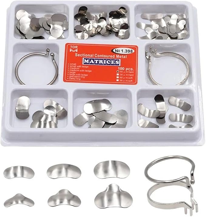 100 adetlik Diş Matriks Bandı Seti, konturlu metal matriksler ve reçine sıkıştırma/ayırma halkaları içerir. Diş hekimleri için tasarlanmış olup, hassas diş restorasyonu, uygun konturlama ve verimli klinik kullanım sağlar.