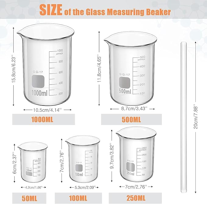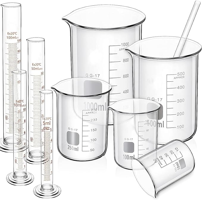 10 parçalı Cam Ölçü Beheri Kiti, 5 ml ila 1000 ml arasında değişen dereceli beherler ve silindirlerin yanı sıra bir karıştırma çubuğu içerir. Kalın, dayanıklı camdan üretilen bu kit, bilim laboratuvarlarında, okullarda ve eğitim projelerinde doğru ölçümler ve deneyler yapmak için idealdir.
